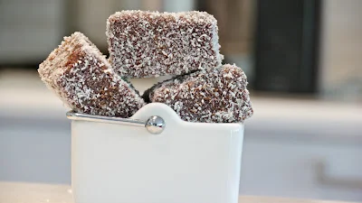 For the chocolate dipping sauce, add milk and butter to a medium hot saute pan and heat to boil or until the butter is melted. Pour the hot milk into a mixing bowl and add the rest of the ingredients (except the coconut) and mix. Let the dipping sauce cool for 3 minutes. Place the coconut in a shallow bowl or pan. Drop a piece of sponge cake into the chocolate sauce and turn it with a fork to coat all sides, then place the dipped cake into the coconut. Using your hand, sprinkle the cake with coconut flakes on all sides. Repeat the process with all the pieces of cake. Store the lamingtons in an airtight container.