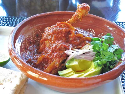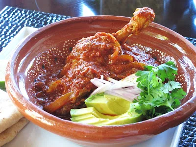 To serve place one leg and half a breast in a clay bowl. Ladle some of the adobo sauce on top of the chicken. Garnish with lime, tortillas, red onion, and avocado. This is gourmet rustic at its best. I will say that Danny was really impressed and actually said "This is as Mexican as Mexican gets. Now what part of you is Mexican?" I told him my right arm was jokingly and continued to serve him seconds. Buen Provecho!