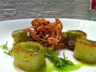 Take a saute pan with 2 tbsp of olive oil on medium high heat. Season the leeks with salt and pepper ( you can call them scallops if you want) and place them in the pan. Cook the leeks on the first side for about 3 to 4 minutes until you get a golden brown sear. Flip over and cook for another 2 minutes and then turn off the pan. Take your beurre monte and spoon all over the leeks very generously. Take a spoonful of the smoked onion puree and place in the middle of the plate. Place 5 leeks around the puree. Take 3 halved roasted balsamic shallots and place around the puree. Place fried shallots on top of puree. Drizzle basil oil all around the leeks. Place chopped tossed frisee around the plate. I forgot the green onions but you could simply slice for a garnish as well. Serve and enjoy "Onions"