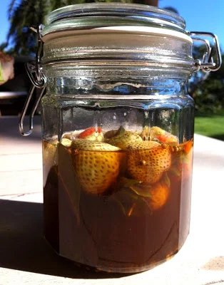Place both vinegars, salt, sugar, and spices in a pot and bring to a boil. Place whole green strawberries into a canning jar. Pour the hot vinegar over the strawberries. Let it cool to room temperature and then keep in the refrigerator. This was a quick pickle I did the day before and the flavor will only get better as time goes on.