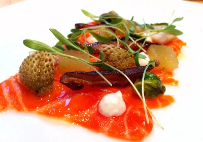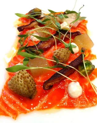 Copper River Salmon Crudo with Pickled Strawberries, Cucumber Gelee and Shiitake "Bacon"