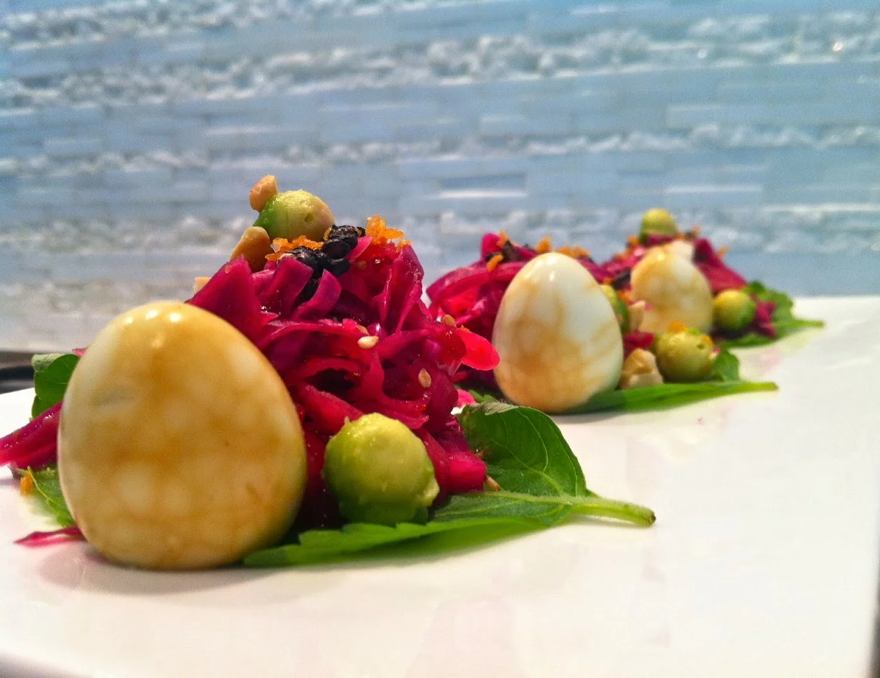 Pickled Red Cabbage, Shiso Hors d oeuvres with Chinese Quail Eggs