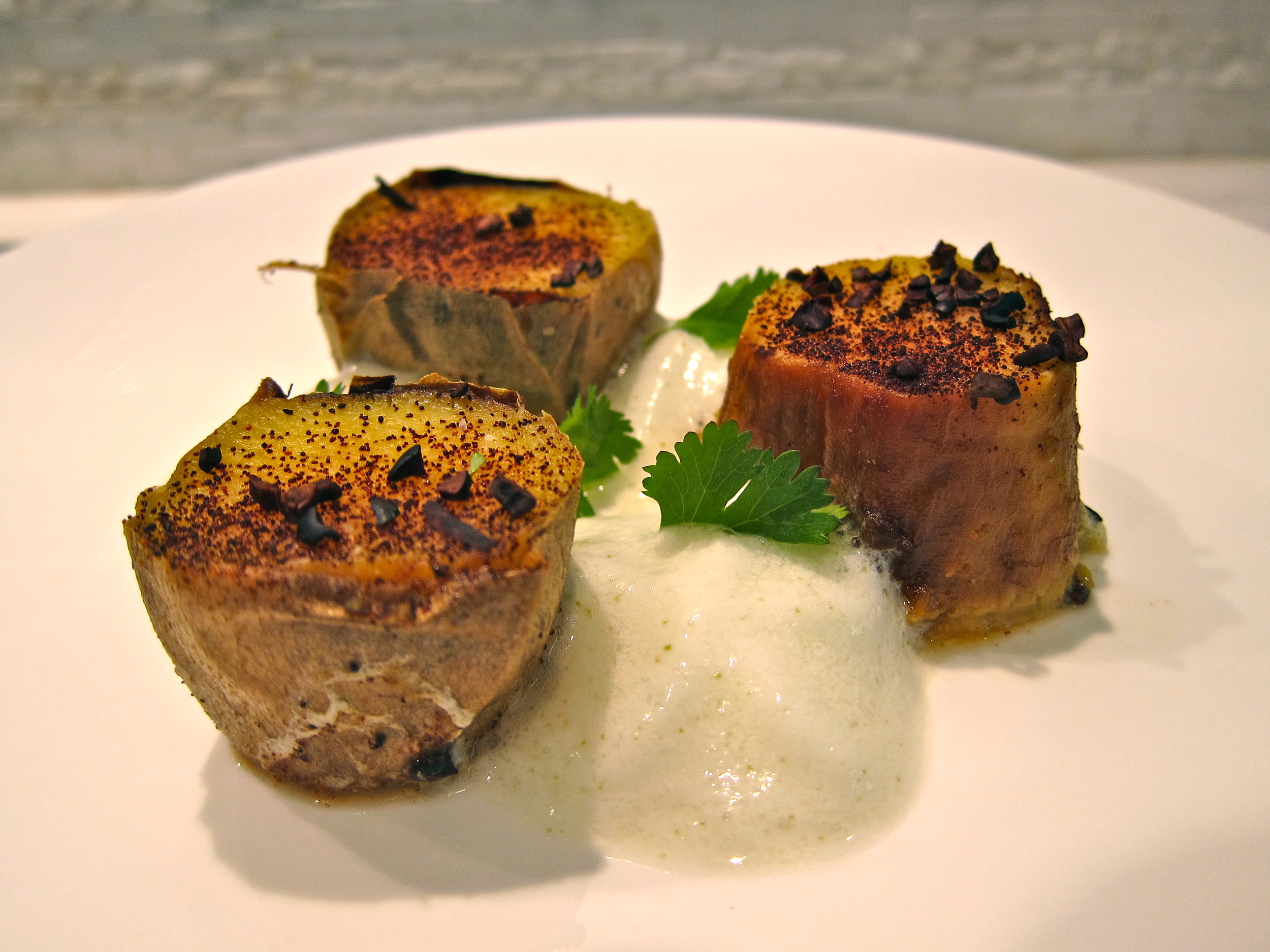 Simply slice the sweet potatoes in 3 pieces, dust with chipotle powder, cocoa nibs, and a pinch of salt. Add your lime foam to the plate and garnish with cilantro. Serve and enjoy!