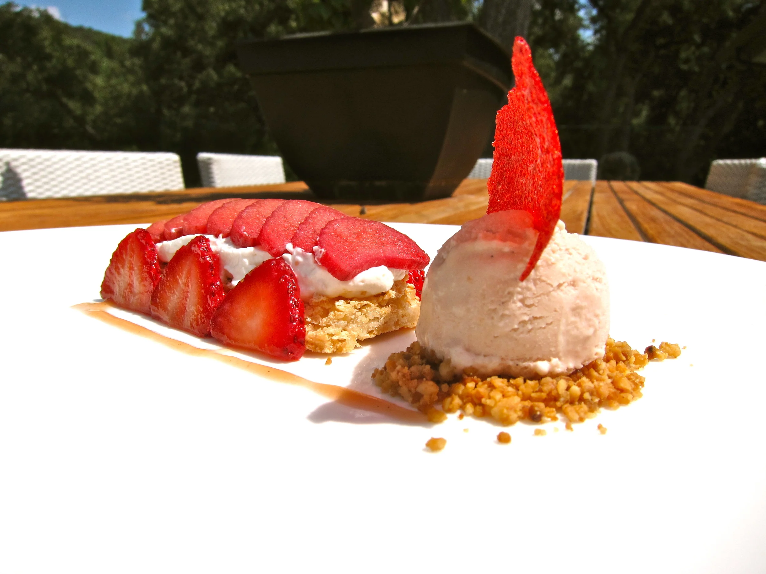 Take your dacquoise and pipe a little whipped cream on top of a 2 inch rectangle. Take a piece of rhubarb out of the plastic bag and carefully slice it. Place it on top of the whipped cream. Then take the strawberries and slice thinly. Place them next to the dacquoise on both sides. Then add a little spoonful of nuts to anchor the ice cream. Add a scoop of strawberry rhubarb ice cream on top of the nuts. Add the strawberry chip on top. Add a little of the rhubarb port glaze to the plate and serve and enjoy! There are a few different looks including a napoleon as an option