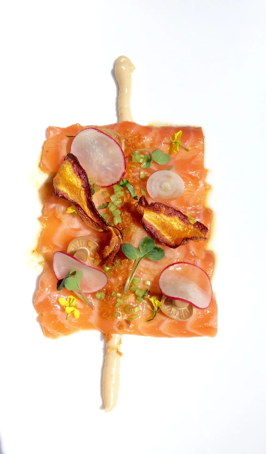 Take four plates and place one streak of miso mayo down on the plate. Then take your salmon and slice thin pieces of sashimi and place on top of the miso mayo. Then spoon on top of the salmon some ponzu. You can add a touch more fresh lemon juice on top if you desire. Then finish by adding the pickled mushrooms, fried garlic, radish, onion, cilantro stems, flowers and fried carrots. Serve and enjoy!