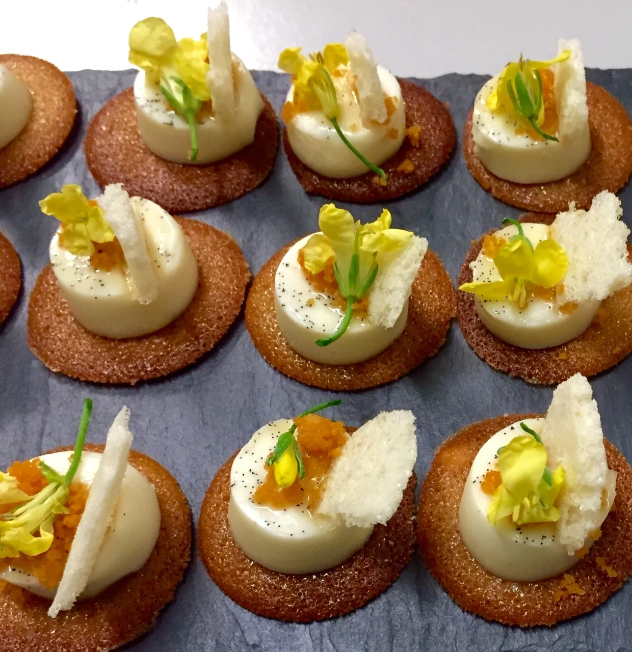 I recently did an event where the theme was revolved around honey. I served 7 different appetizers all having honey as an ingredient. Somewhere more subtle than others. This one I think had a nice balance of honey, not too much and not too little. I called this "milk and honey" because it has a few different textures of milk along with the honey in the recipe. Some people don't always understand why appetizers can be expensive but in essence as a chef you are trying to make a complete dish in one or two bites. The base of the recipe is a vanilla, chamomile-honey panna cotta which sits on a honey tuile cookie, topped with caramelized milk and dehydrated honey milk foam. A really long description for a tiny bite but I think the results where a big hit with the group I served. Here is the recipe I hope you enjoy!