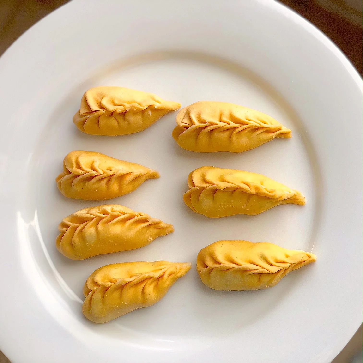 In a bowl with both flours mixed well. Make a hole or well in the center of the flour. Add the water and mix with your hands until you make a dough. Knead the dough for 10 minutes until smooth and then wrap and allow it to rest. Then using a bench scraper or knife cut the dough in half. Then take your dough and pass it through the pasta machine and work it down to the 2nd to last setting. Repeat the same process. Then use a 3 1/2-inch ring mold to cut out circles. Then take your filling and place in the center of the round disk. You want to over stuff the round. Then fold the pasta into a “taco” shape around the filling. Fold in the bottom of the taco and pinch the edges together. As you are folding the seam you should be pushing the filling out the the round. Continue this step until the pasta is sealed tightly. It should look like a zipper. Continue until you all have no more filling