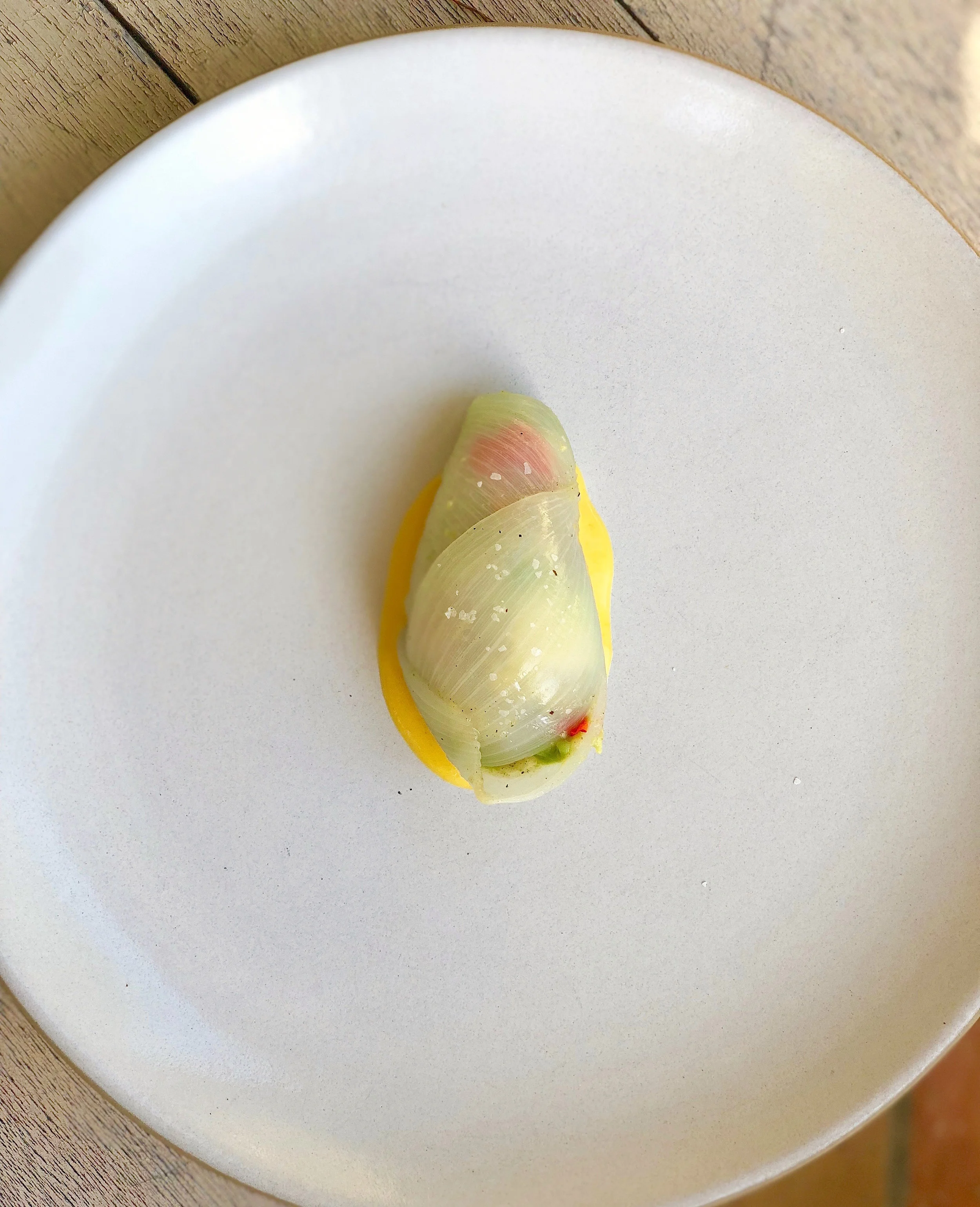 Then place a spoonful of the onion puree inside the middle. Add a slice or two of the avocados and season with salt. Add the nasturtium flowers. Then fold over the layers into a tight light onion "bulb".