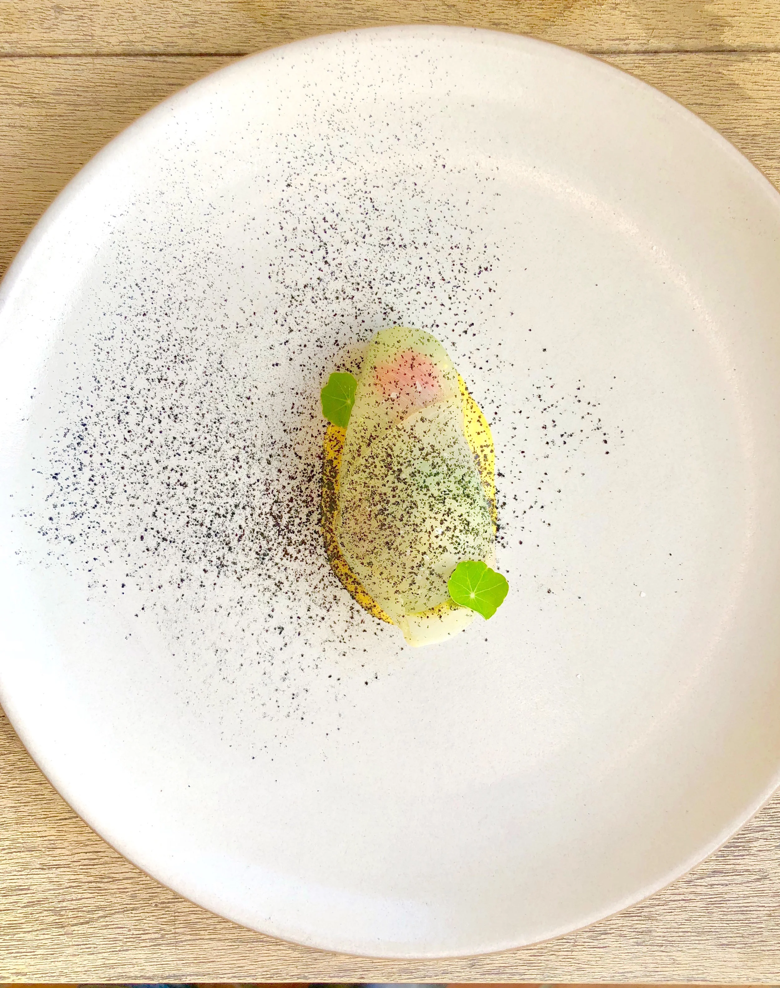 This was the first course on Jp and Eloise's 25th anniversary dinner the other night. This dish looks so simple and it is. Great dishes, the simple one, come from take just a few ingredients and letting them shine. This is one of those recipes. I went to a local farm in Malibu and they picked me 4 maui onions with the large green tops still intact. I decide to simply grill the onions, and completely char the tops for the onion powder. When you char sweet vegetables and then grind them into powder your mind thinks that this ash is just ash, but when you apply to food it actually gives a smokiness to the dish.