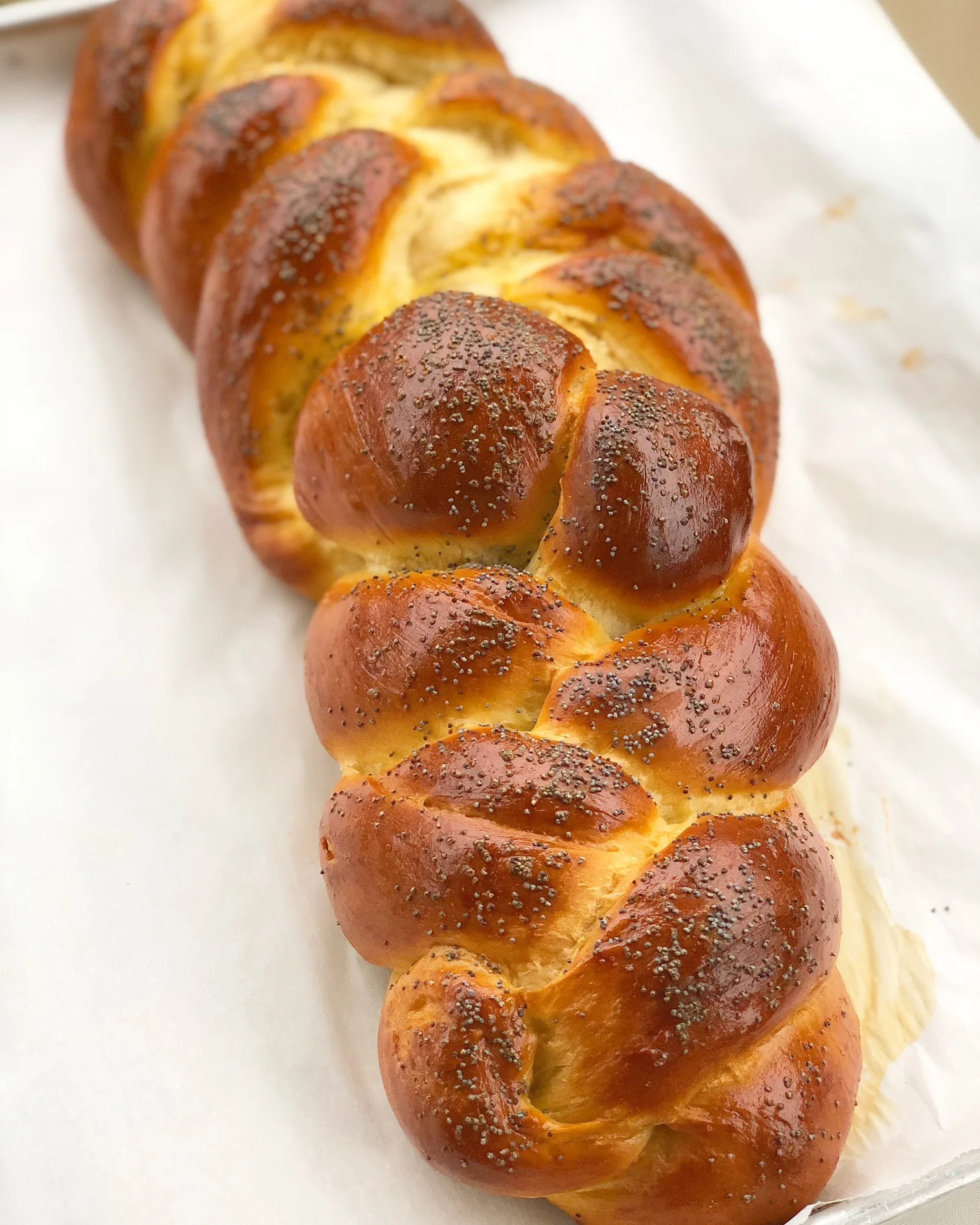 In a mixing bowl add warm milk, yeast, and 1 tbsp of sugar. Whisk together well and allow to sit for 5 minutes. Then add oil, eggs into the bowl. Add 6 cups of bread flour and salt and turn the mixer on low speed. Mix until the the dough starts to come together. If need be add the 1 cup of the all purpose flour. Once the dough comes together. Take the dough out of the bowl and knead for 5-7 minutes. Coat the mixing bowl with oil and place the dough back in the bowl. Cover with a towel and allow the dough to double in size. Then take the dough out of the bowl. Divide the dough in half. Then divide each half into 3 equals parts. Take the 3 equal pieces of dough and roll them out to about a 1 - 1 1/2 ft long. Then take the 3 ropes and braid them interweaving them. Place the braided dough onto a sheet pan lined with parchment paper. Cover the loaf with a towel and allow the loaf to proof for another hour. Take the last egg and beat well, brush the loaf with egg wash and cover with poppy seeds and place in the oven and bake 30-35 minutes until the internal temperature hits 190 degrees. Take out and let it cool on a rack until completely cooled.