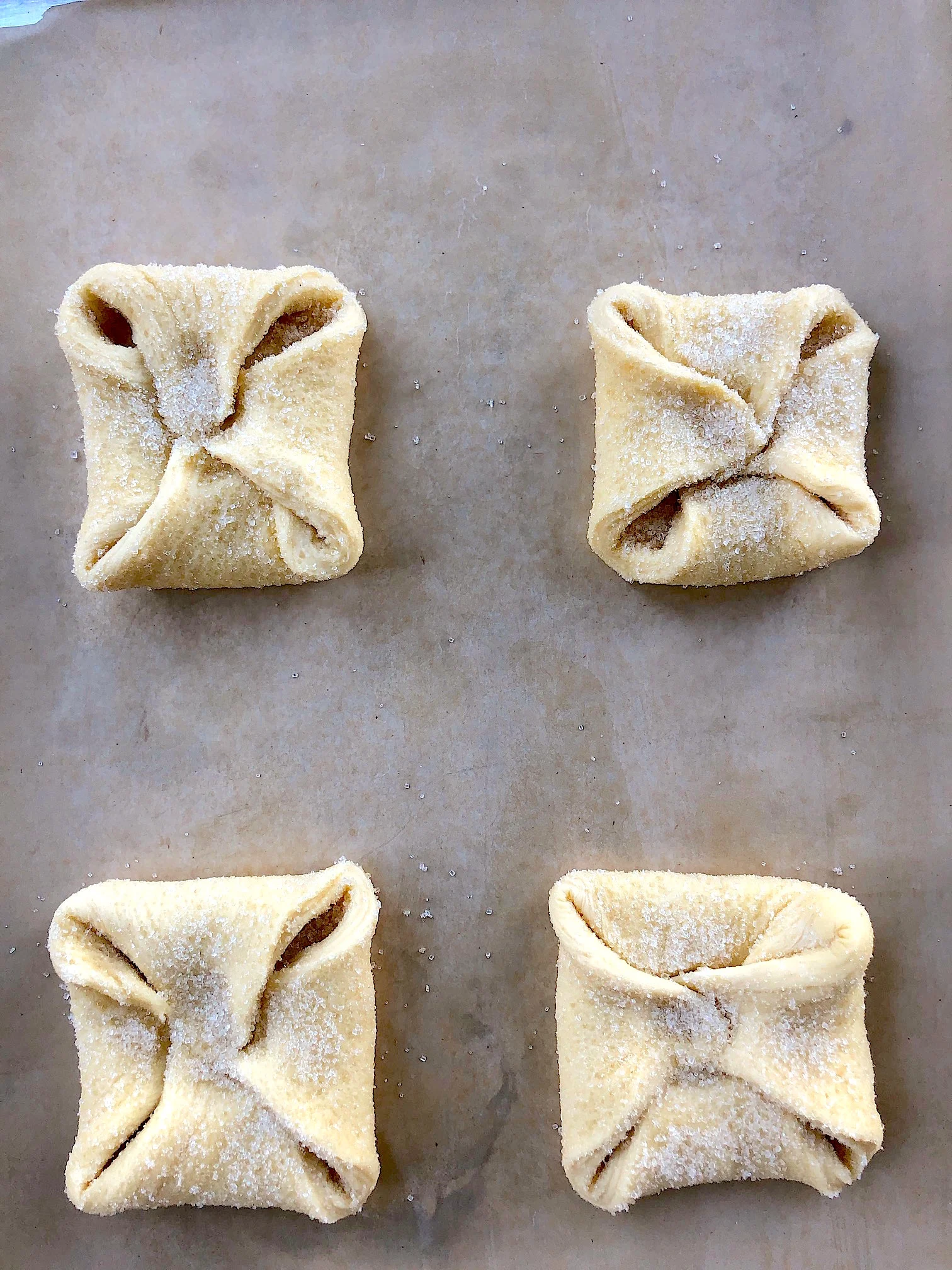 So once you have your dough turned 3 times take your dough (1/3 for me) and douse your cutting board with about a cup of sugar. Spread it all over your cutting board (think of it as your bench flour and us it heavily), if you are like Dominique here you can’t use enough sugar . Then roll the dough out into a nice square, flipping the dough over a few times insuring that both sides get plenty of sugar rolled into the outside. Once you have rolled a nice square dough cut it into 4 large squares. Then douse each square with more sugar. Then take the four corners and bring them to the center each time pushing down hard into the center making sure the corners don’t pop up. Sprinkle with sugar once more on the top of the kouign-amman. Then spray a large muffin pan with non stick spray. Place each kouign-amman inside one muffin slot until you have all of them in the muffin pan. Cover and allow to rise for 20-30 minutes.