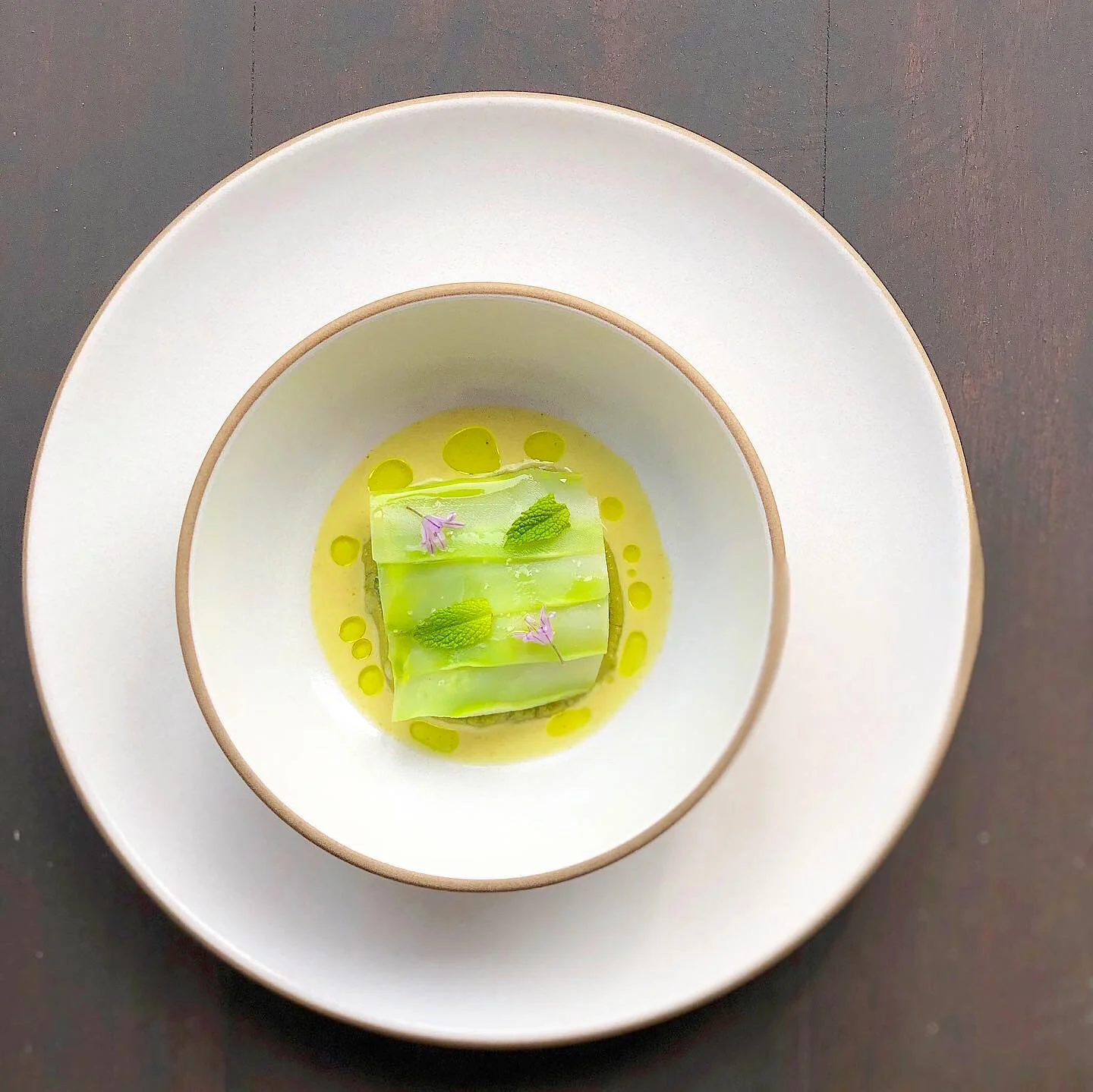 4 broccoli stems peeled, shaved thin and blanched (held at room temperature)