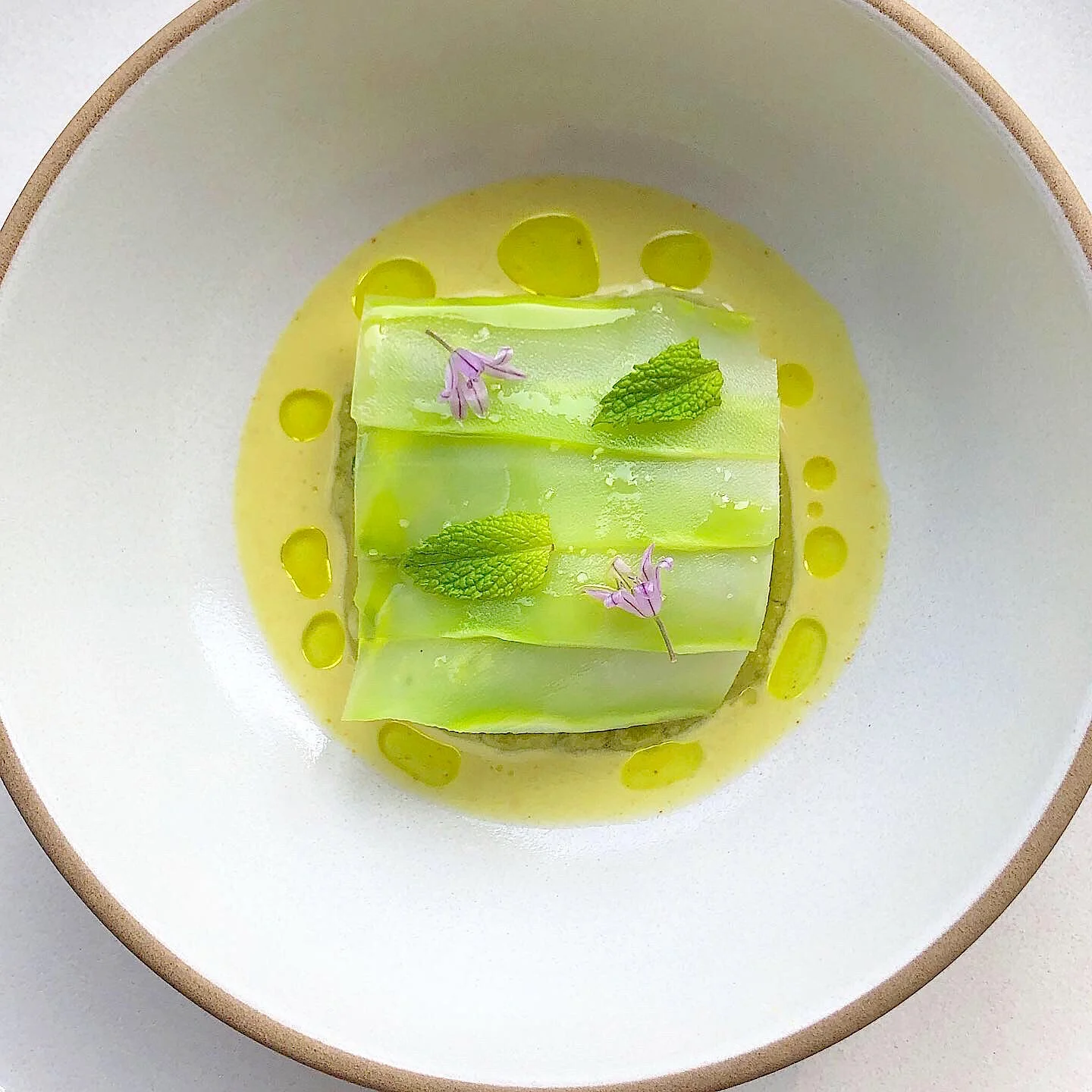 Place the 2 cups of broccoli heads into the warm curry broth. Season lightly with salt and cook for 3-5 minutes until the broccoli is tender (you might need to do this in batches) . To plate place a few spoonfuls of broccoli puree in the bottom of the bowl. With a spider or a perforated spoon scoop out the broccoli crowns out of the curry broth. Then take 4 slices of blanched room temperature broccoli stems and place on top. Season with salt. Then ladle a little extra curry broth around the bowl. Finish with curry oil, herbs, and flowers. Serve and enjoy!